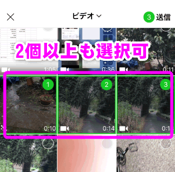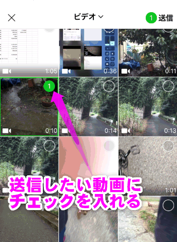 あとは送りたい動画にチェック(タップする)し、右上の「送信」をタップします。