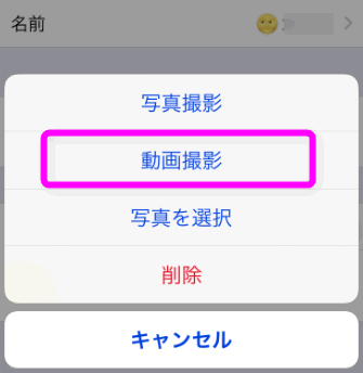 「写真撮影」「動画撮影」「写真を選択」「削除」とあるので、「動画撮影」をタップします。