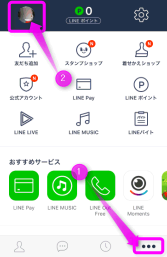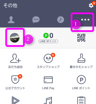 続いてLINEを起動し、①の右下にある「・・・」をタップし、②の左上にある自分のプロフィールをタップします。