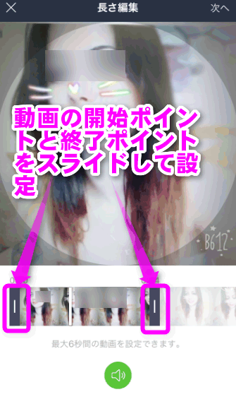 6秒以上撮影した場合は、好きなシーンをトリミングすることが出来ます。