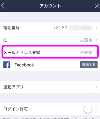 「アカウント」を開き、「メールアドレス登録」の部分が「未登録」となっていると登録できません。