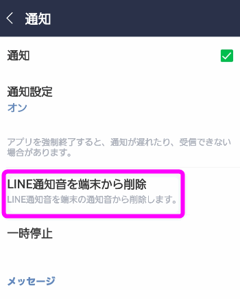 アンドロイド版LINEの「通知」の中には「LINE通知音を端末から削除」という項目があります。ここをタップすると・・・