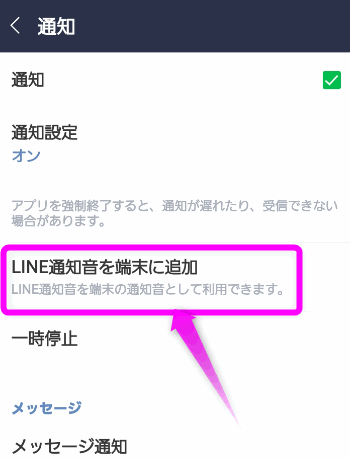 元のLINEオリジナルの通知音が使いたい場合は、「LINE通知音を端末に追加」をタップします。