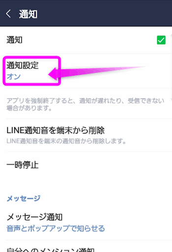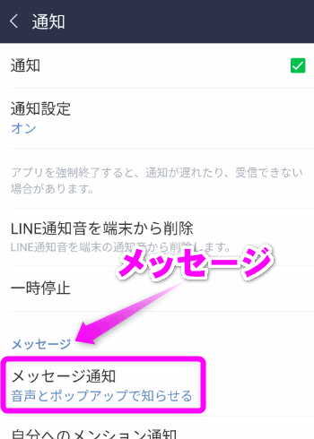 「通知設定」か「メッセージ」にある「メッセージ通知」をタップします。