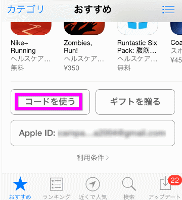 App Storeが開いたら下の方にスクロールしていき、「コードを使う」をタップします。
