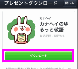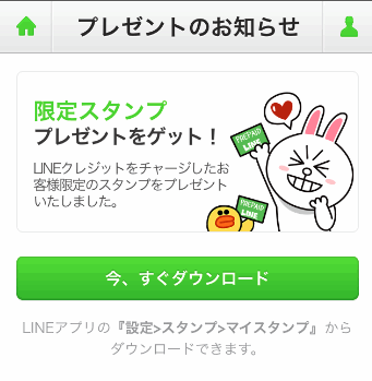 はじめてLINEプリペイドカードをチャージした場合に、無料でもらえる限定スタンプが表示されるので、「今、すぐダウンロード」をタップします。