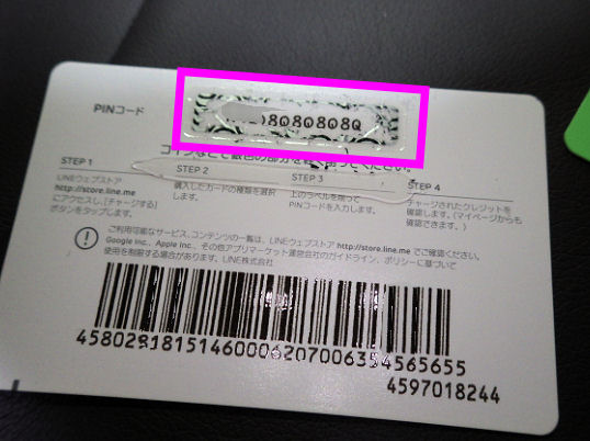 コンビニなどで「LINE プリペイドカード」を購入したら、裏側の銀色の部分をコインなどでこすり、ナンバー(PINコード)を表示させます。