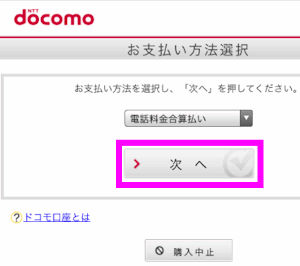携帯代から支払うか(ドコモの場合「NTT DOCOMO利用料金と一緒に支払い」)選択します。