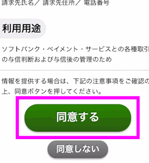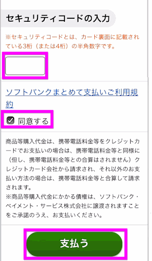 ソフトバンクの料金の支払いに使っているクレジットカードの「セキュリティコード」を入力し、「同意する」にチェックを入れて、「支払う」をタップします。