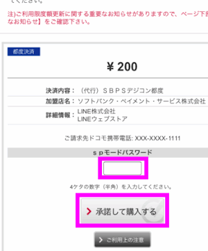 ドコモの携帯代と一緒に請求するような支払いを選択した場合は、spモードパスワードを入力する画面が表示されるので、4桁のパスワードを入力します。