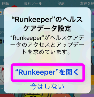 インストールの途中で、このように「ヘルスケアデータ設定」の画面が出たら、「Runkeeperを開く」をタップしてください。