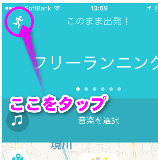 起動すると基本画面が表示されます。「フリーランニングを開始」をタップすればすぐにでも開始できます。が、その前にいろいろ設定をしておきましょう。