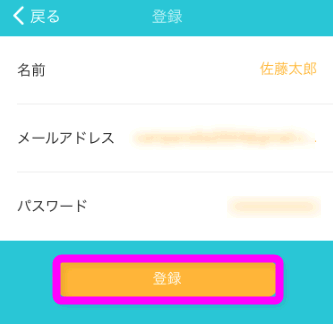「名前(日本語も可)」と、「メールアドレス」、「ログイン用のパスワード」を入力します。