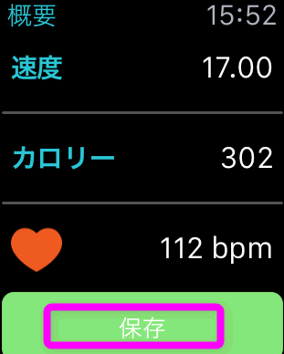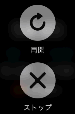 「再開」したい場合や、記録を停止したい場合は、「一時停止」した後、もう一度ディスプレイを強く押すとこのような画面になるので、ボタンをタップします。