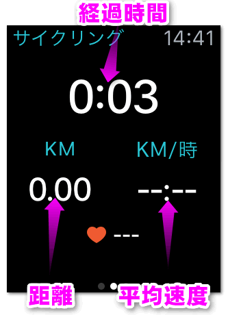 一番上が「経過時間」。中央左が「走行距離」。中央右が「平均時速」。他のアプリと違い、現在の速度ではなく平均速度が表示されるようです。