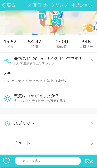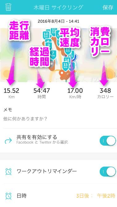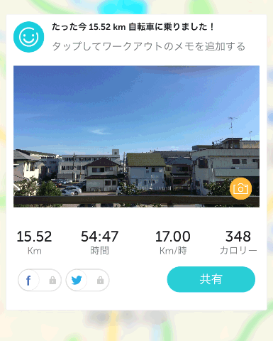 それ以外にも走行後、ツイッターやFacebookにデータを投稿できる機能もあります。