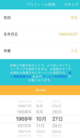 生年月日はパスワードを忘れた時の認証として。体重は消費カロリーの計算などに使われます。
