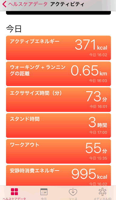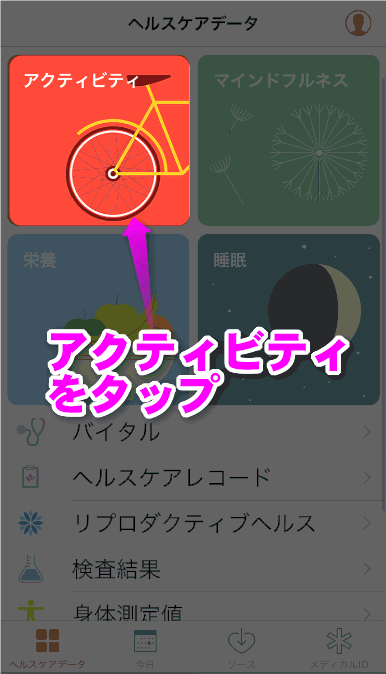 ヘルスケアを起動すると、このような画面になるので「アクティビティ」をタップします。