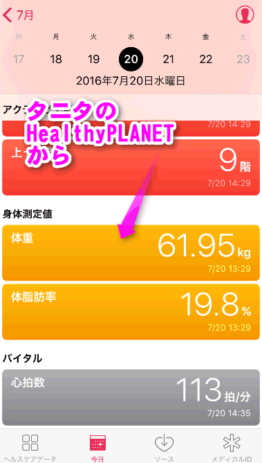 さらに下にスクロールしていくと、タニタの「ヘルスプラネット」で記録した体重や体脂肪率、そしてApple Watchで記録した心拍数も見ることができました。