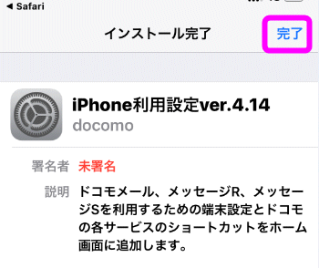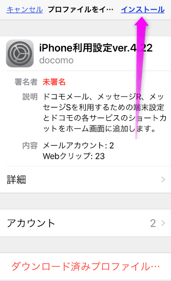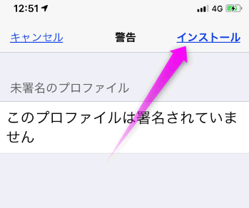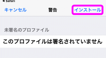 「このプロファイルは署名されていません」と表示されますが、右上の「インストール」をタップします。