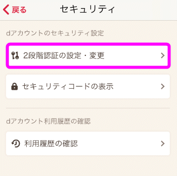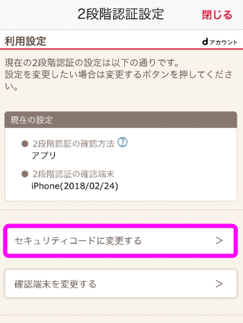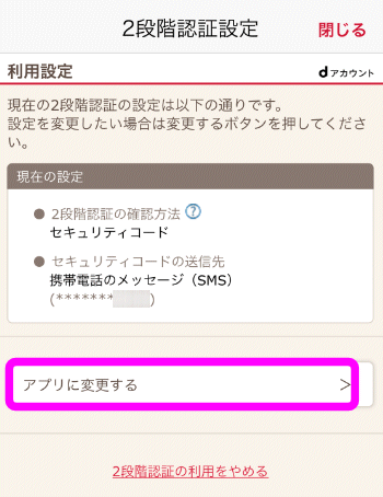 現在、2段階認証はSMSによる「セキュリティコード」の入力なので、「アプリに変更する」をタップします。