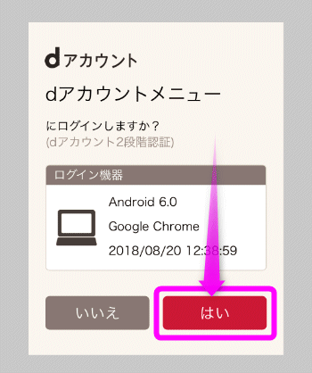 デフォルトではSMSにセキュリティコードが送られてきますが、「dアカウント設定」アプリで2段階認証を許可させることもできます。このアプリによる2段階認証を利用すると、いちいち6ケタのコードを入力しなくても、「はい」をタップするだけで認証ができます。