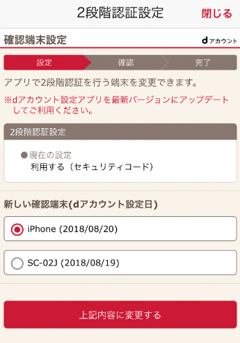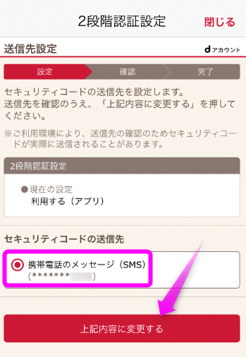 「2段階認証利用設定」の「利用する」にチェックを入れ、「上記内容に変更する」をタップします。