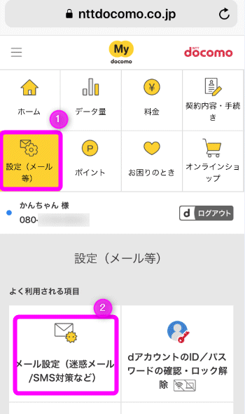 My docomoを開き、①「設定(メール等)」をタップし、②「メール設定(迷惑メール/SMS対策など)」をタップします。