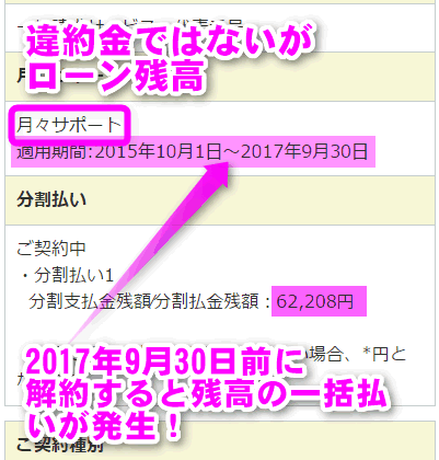 この期間以内に解約してしまうと、「月々サポート」(端末代の割引)が無効になり、ローン残高を一括で支払う必要があります。
