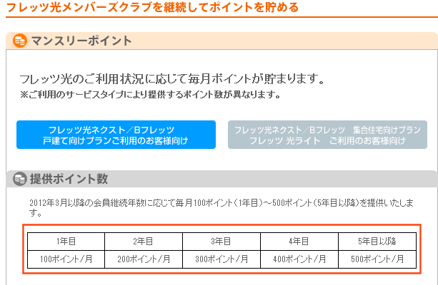 しかもはじめの1年目は、月々100ポイントずつたまり、契約期間が長くなるごとに100ポイントずつ増え、5年目以降は最大500ポイントが毎月貯まるらしい。