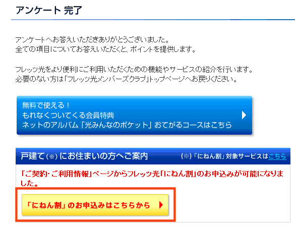 サポートの電話ではFLET'S光メンバーズクラブに加入すると、更に割り引き(正確にはポイントが付く)になりますよ。というので、メンバーズクラブに入会し、アンケートに答えた(アンケートに答えると300ポイントが付く)ところ、アンケート終了画面に「にねん割」申し込みページのページヘのリンクが!