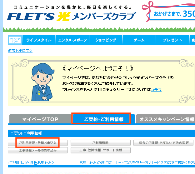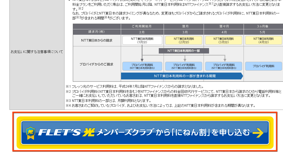 FLET'S光メンバーズクラブにログインして、フレッツ光の公式ページのにねん割のページヘ行きます。