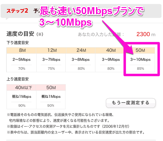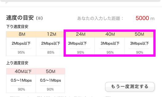 NTT基地局からの距離が2,300mだと、最も高速なプランの50Mbpsでも、3~10Mbpsしか出ないようです。とはいえ、3~10Mbpsはかなり高速なので、基本的にはYouTubeなどを見るには支障がないレベルだと思います。ただ、24Mbpsプランでも3~8Mbps出るので、安い24Mbpsプランを選択するのもありです。