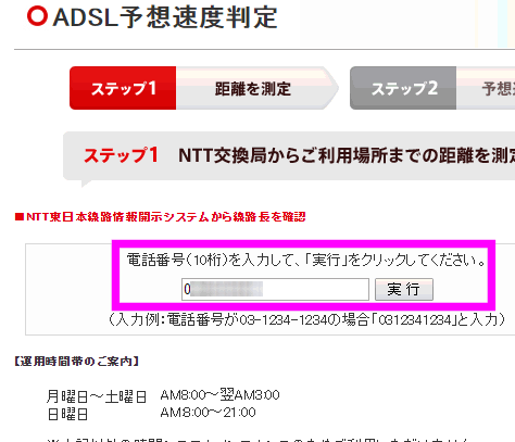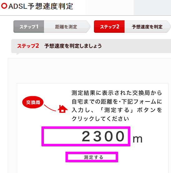 今度は、こちらの速度測定ページを開き、NTT基地局からの距離を入力します。下の「測定する」をクリックします。