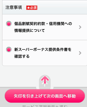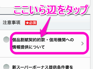 「タダで機種変キャンペーン」を申し込んだ場合、「個品割賦契約約款・信用機関への情報提供」の注意書きに目を通さないといけません。直接チェックができなくなってるので、一旦四角で囲った部分をタップします。