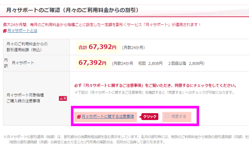 ここでも「月々サポートに関する注意事項」をクリックし、「同意する」にチェックを入れてください。