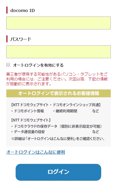 docomo ID(docomoのメールアドレス)とパスワードを入力して、ログインをクリック(もしくはタップ)します。