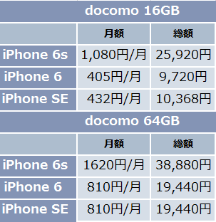 続いて、ドコモのiPhone 6s 、 iPhone 6 、 iPhone SE の2年間の支払額と、6sとの差額、16GB版との差額を比較。