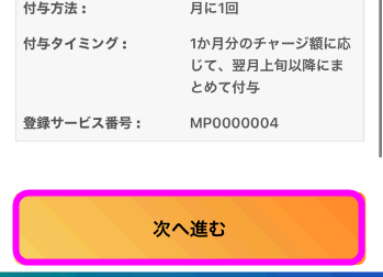 「付与タイミング」では「1か月分のチャージ額に応じて、翌月上句以降にまとめて付与」と記載されています。