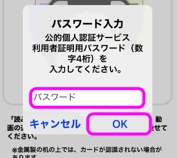 マイナンバーカード取得時に設定した4桁の数字の暗証番号を入力し、「OK」をタップします。