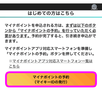 アプリを立ち上げると、このような画面になります。「はじめての方はこちら」にある「マイナポイントの予約(マイキーIDの発行)」をタップします。