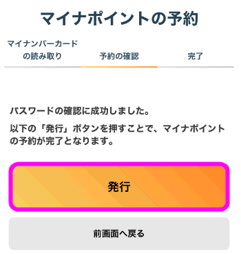 「パスワードの確認に成功しました」と表示されるので、「発行」をタップすると予約の完了(マイナポイントの申請)です。