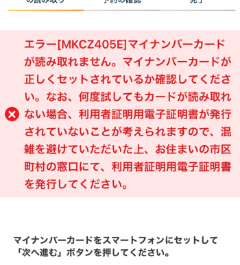 このように「エラー[MKCZ405E]マイナンバーカードが読み取れません。マイナンバーカードが正しくセットされているか確認してください」というようなエラーが表示されてしまう場合、スマホの位置と、読み取りが完了するまでにスマホを動かしてしまうのが原因です。