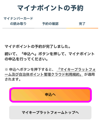 マイナポイントの予約が完了すると、このような画面になるので「申込へ」をタップします。