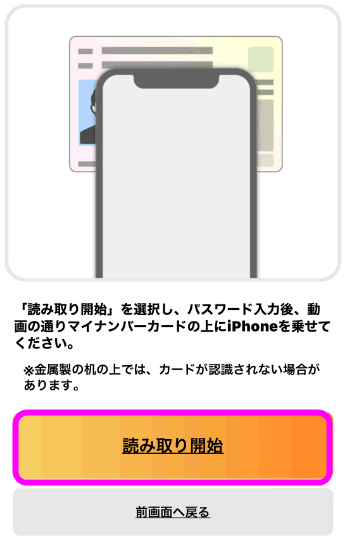 ここでもう一度マイナンバーカードが必要になってきます。「読み取り開始」をタップ。