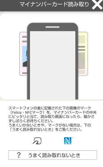 アプリを立ち上げた時点でもう、マイナンバーカードを読み込む手続き。
