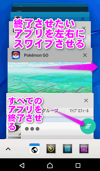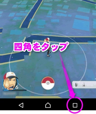 アンドロイドの場合、ホームボタンの横に四角いボタンがあるので、ここをタップします。エクスペリアの場合は、右下ですが、Galaxyなどは左側の機種もあります。
