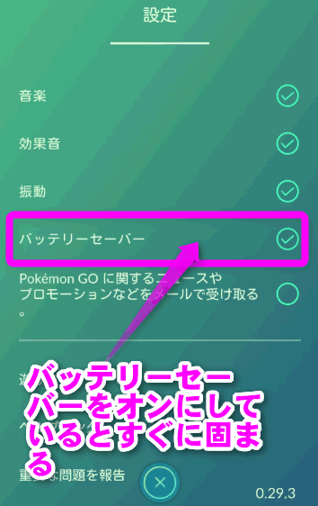 ポケモンGOには、画面を見ていないときは暗くする「バッテリーセーバー」という機能があります。が、これをオンにしていると頻繁にフリーズしたり固まります。なので、今のところはオフにしておいたほうがよさそうです。