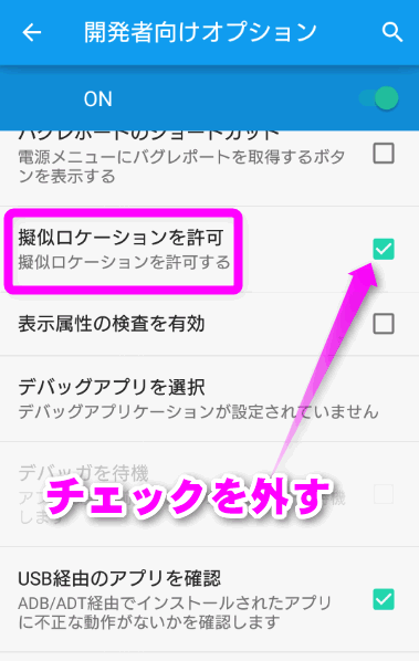 このように「位置情報を取得できません」というエラーが出て、一向に消えない場合は、「疑似ロケーションを許可」がオンになっている可能性が高いです。