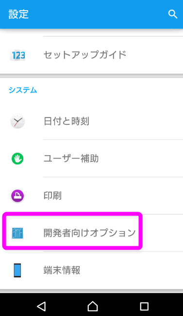 「設定」を開き、下のほうにある「開発者向けオプション」をタップします。